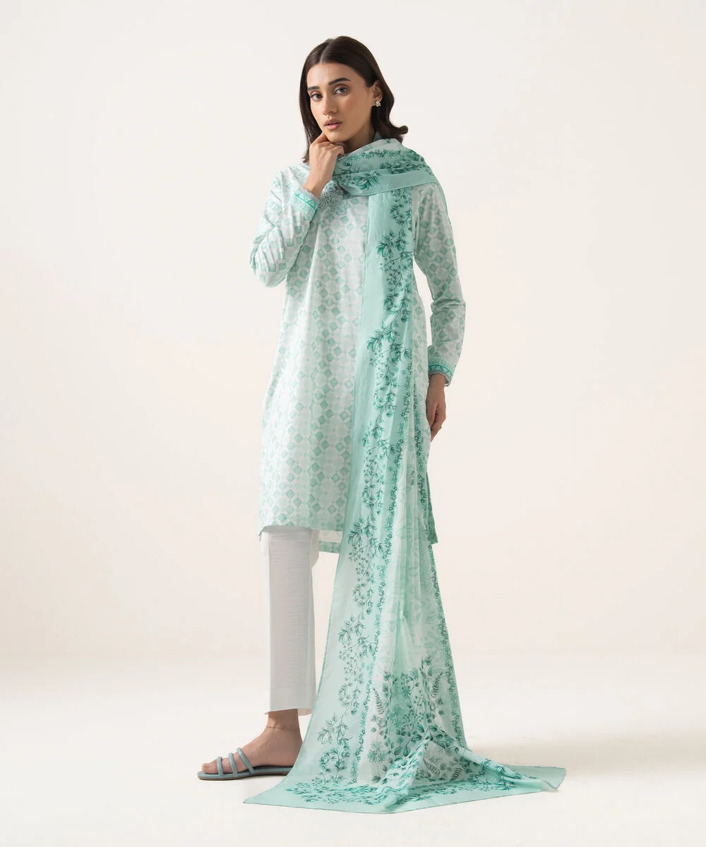 - 2 piece Ready-To-Wear printed lawn shirt with embroidered schiffli borders and paired with Qlot printed cotton pants