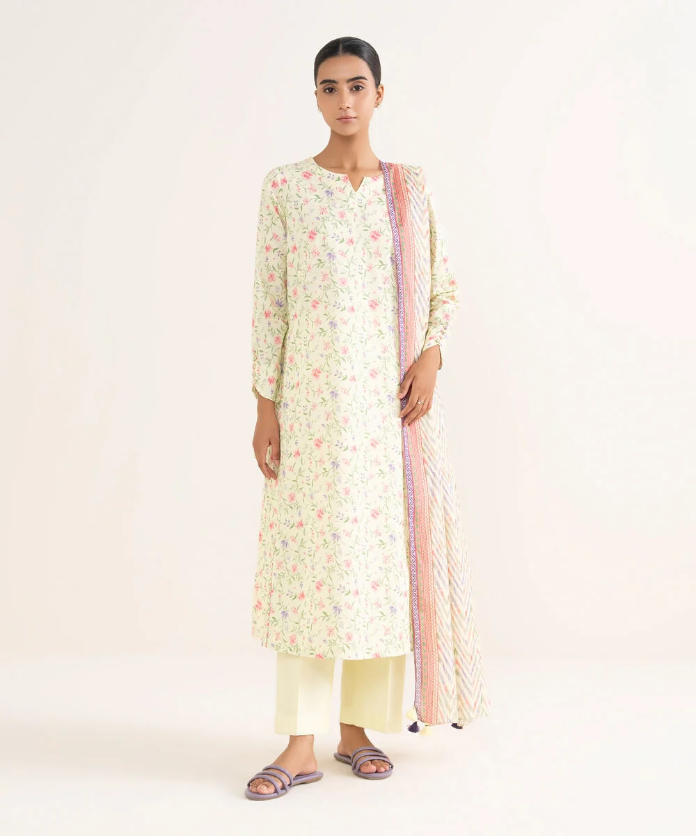 - 2 piece Ready-To-Wear printed lawn shirt with embroidered schiffli borders and paired with Qlot printed cotton pants